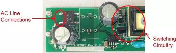 圖1是這些非計劃中電容的一個實例。圖中的右側(cè)是一個垂直安裝的FET,所帶的開關(guān)節(jié)點與鉗位電路延伸至了圖片的頂部。輸入連接從左側(cè)進(jìn)入,到達(dá)距漏極連接1cm以內(nèi)的位置。這就是故障點,在這里FET的開關(guān)電壓波形可以繞過EMI濾波器耦合至輸入。