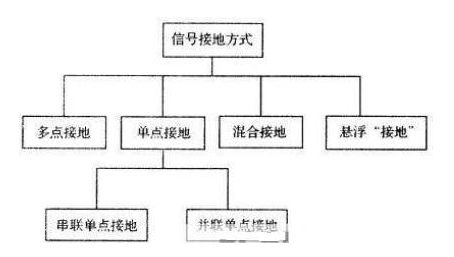 在低頻電路中,信號(hào)的工作頻率小于1MHz,它的布線和器件間的電感影響較小,而接地電路形成的環(huán)流對(duì)干擾影響較大,因而應(yīng)采用一點(diǎn)接地。當(dāng)信號(hào)工作頻率大于10MHz時(shí),地線阻抗變得很大,此時(shí)應(yīng)盡量降低地線阻抗,應(yīng)采用就近多點(diǎn)接地。當(dāng)工作頻率在1MHz~10MHz時(shí),如果采用一點(diǎn)接地,其地線長(zhǎng)度不應(yīng)超過(guò)波長(zhǎng)的1-20,否則應(yīng)采用多點(diǎn)接地法。工作接地按工作頻率而采用如圖所示幾種接地方式。